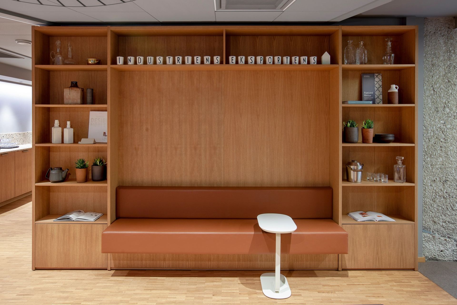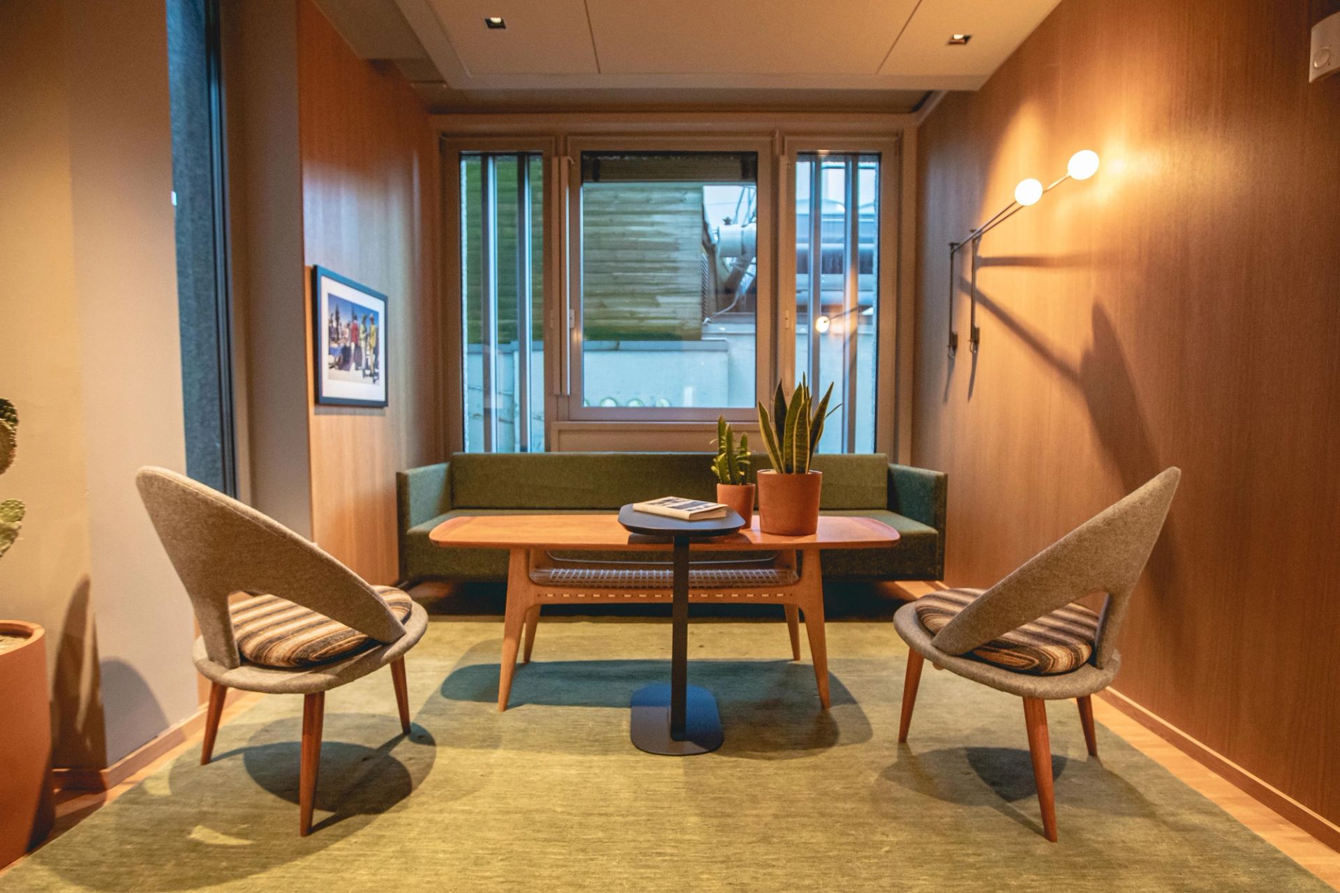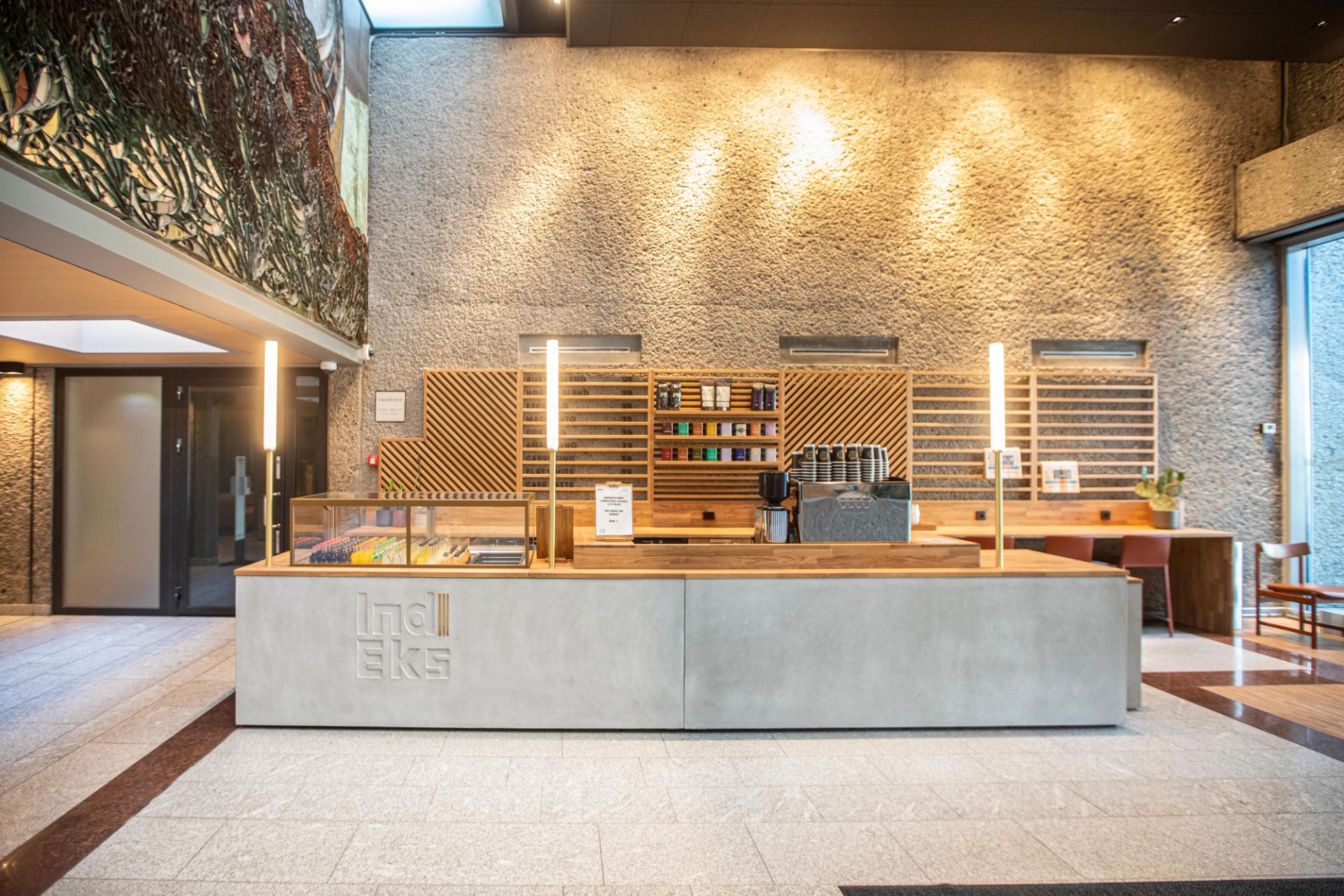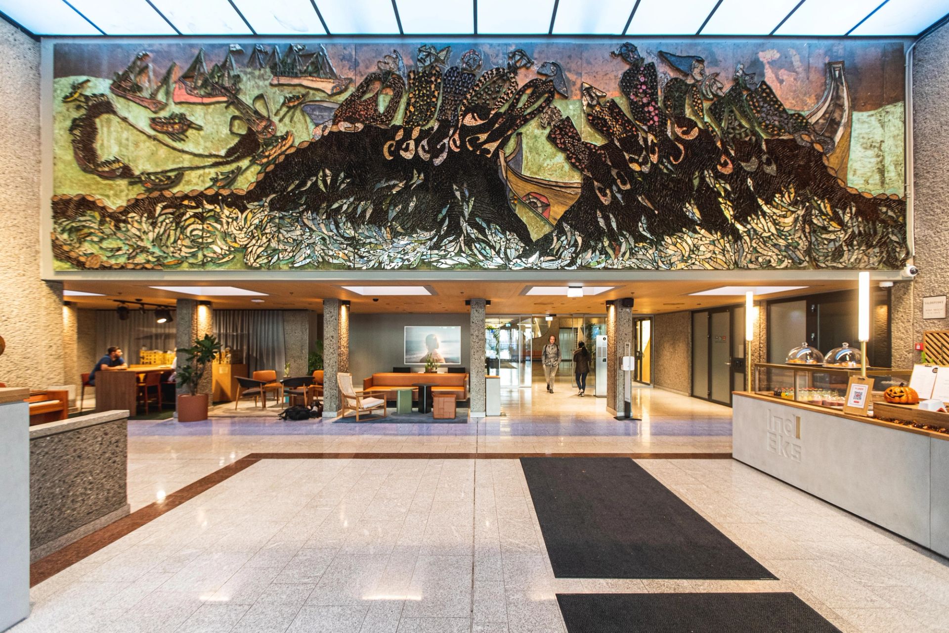 Interiøret er inspirert av Indekshusets ikoniske 60-tallsarkitektur. Klassiske skandinaviske møbler fra midten av århundret er blandet med ny norsk design og skreddersydde skap i tre for å skape en avslappet, men trendy atmosfære med et vink til fortiden.